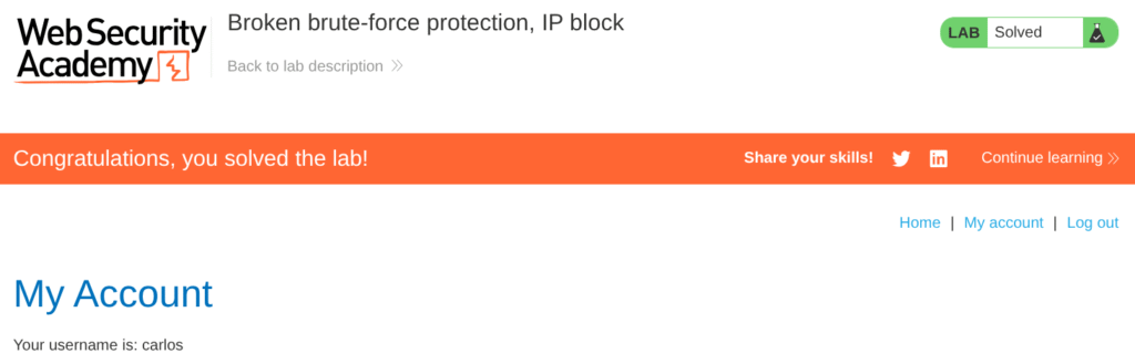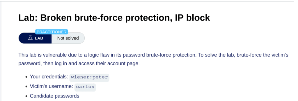 The first lab we’ll dig into is broken brute-force protection, IP block. This lab scenario assumes that you already have working login credentials (wiener:peter), have already enumerated a known username, carlos, and you have a list of dumped passwords to try against the app. There are plenty of methods developers use to help reduce the capacity for malicious actors to brute-force their web applications, and one common one is to block an IP address that makes too many failed attempts within a span of time.