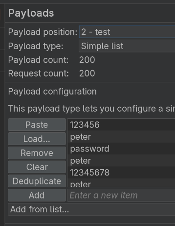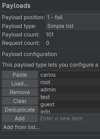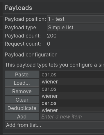 The reason we’re not actually surrounding the password is because we will iterate the usernames with a list we have, but also issue a null payload that we can control the quantity of (to intentionally trigger the account lock after, in this example, five incorrect tries). Set payload one to a simple list and load the username list provided by PortSwigger (be careful not to upload/paste the interleaved list we just created in the last example):