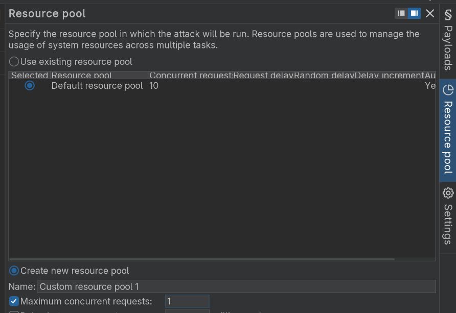 The next setting to change is the Resource pool. We want our attacks to be forced to always go in the order our files designate. Set the maximum number of concurrent requests to one: