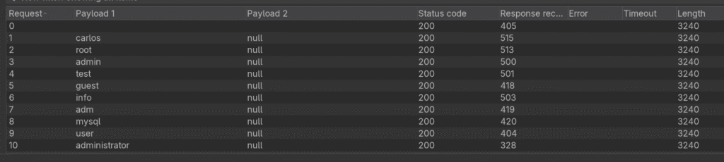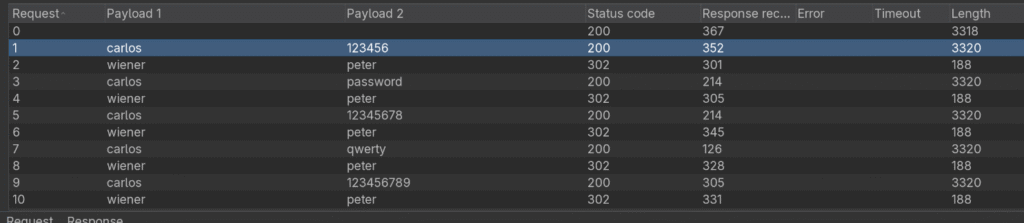 Run the attack. Sort by the length and one of the responses does not return an “Invalid username/password” error, it has a different length and is our target password credential: