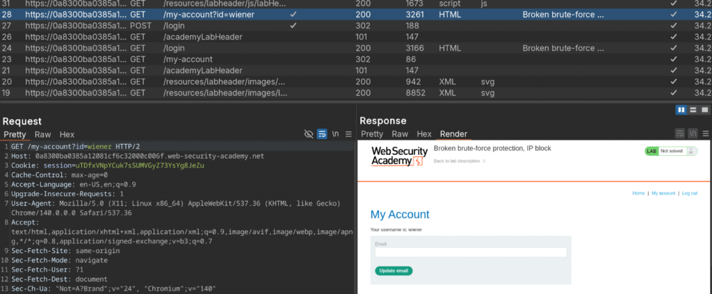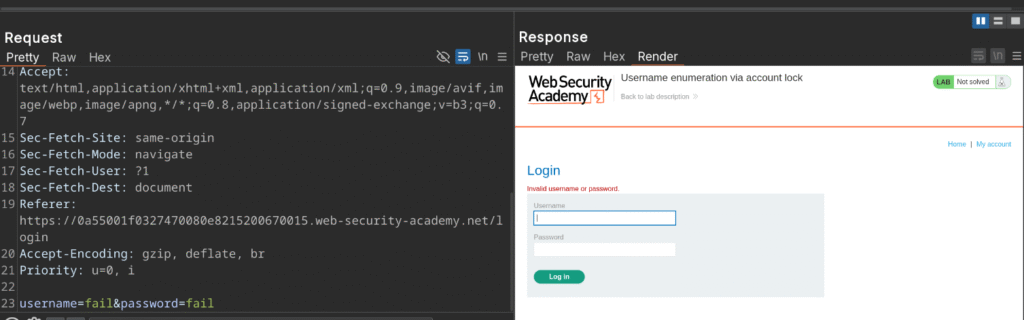 This lab showed how an account lock can unintentionally reveal valid usernames, so the simplest fix is to stop leaking that signal. Always return a uniform response for invalid credentials and locked accounts, with the same status code, body size, text, and similar timing so attackers cannot distinguish hits by response content or length. Enforce per-account throttling and progressive backoff, keep IP rate limits as a separate and independent control, and introduce CAPTCHA or step-up MFA for suspicious flows. Notify users out of band about account locks, log auth attempts with account and IP context, and alert on abnormal spikes. Add automated tests that simulate enumeration and interleaved attacks to validate your defenses.
