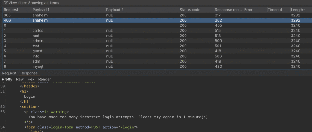 But… once the attack is done, sorting by the response length shows that there is an account that returned two responses of “You’ve made too many incorrect login attempts” (also alerting us that account locks show up after three failed attempts, granting more recon data):