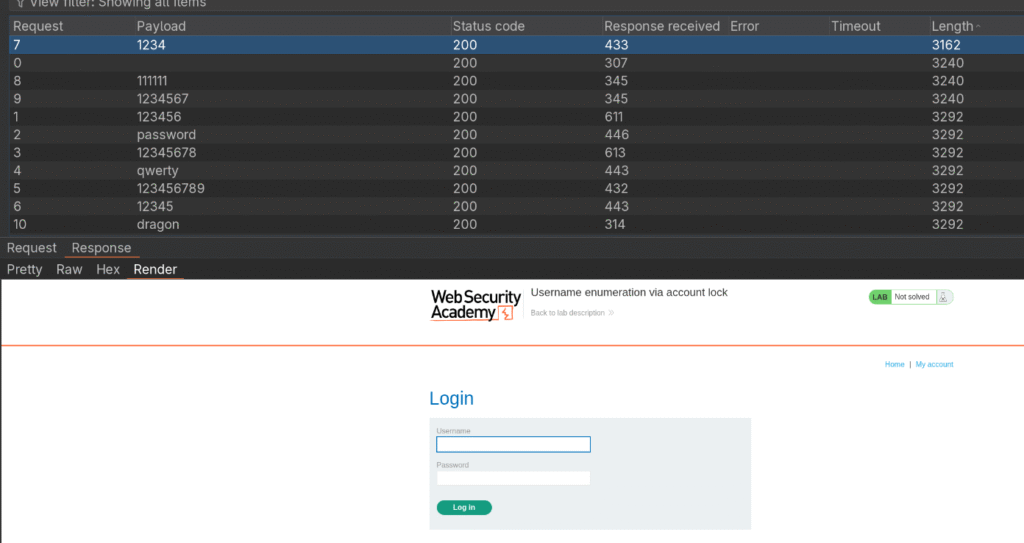 TL;DR: The account lockout response leaked which usernames exist, so I used a cluster bomb with controlled null payloads to trigger lock messages and identify a valid user, then brute-forced the password.