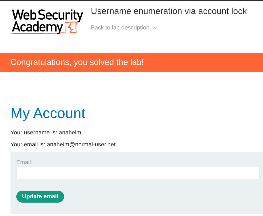 The next lab we’ll look at is username enumeration vis account lock. The protection in this web app is implemented in a way that will lock accounts after too many unsuccessful tries. Ironically, it is this protection attempt that also reveals to a malicous actor through reconnaissance which accounts actually exist at all.