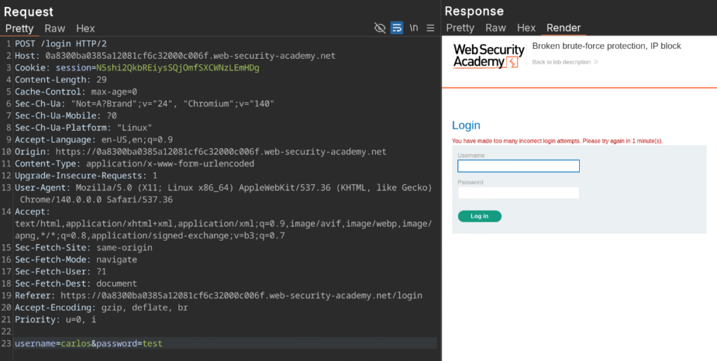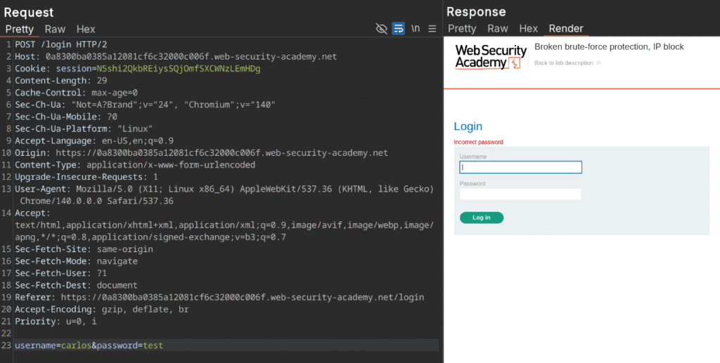 Where this application is crucially flawed though, is that if a malicious actor logs in with valid credentials, it resets the failure counter from one to zero if the user then logs in with valid credentials. I did a test of valid and then invalid credentials five times in Repeater and found that I was able to bypass the IP blocking. This can be readily expoited with clever crafting of an attack sequence.