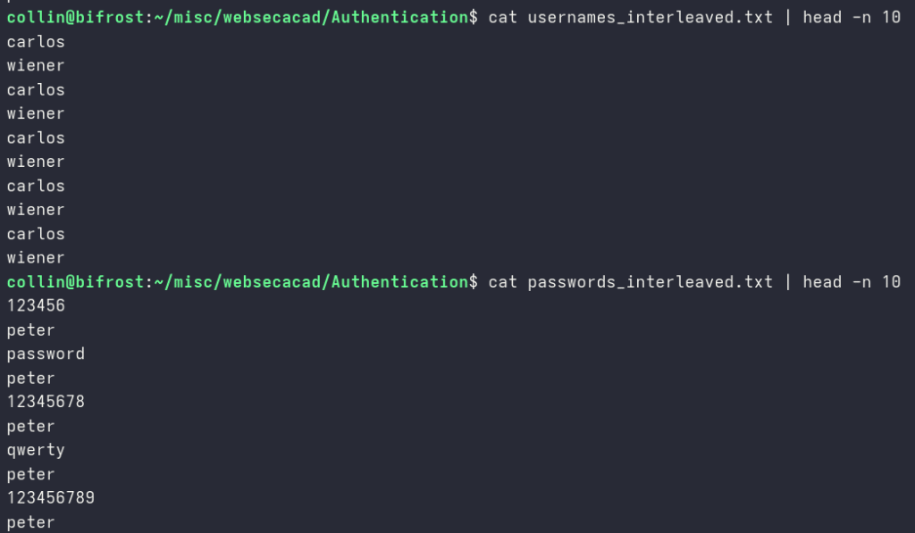 One quick and easy way we can hack this username list together is with a short bash script that will produce an interleaved list for us. We’ll loop 100 times (since we already know our password list we’re brute forcing with has 100 potentials) and push carlos and wiener onto separate lines. When this is done, it shoots it out into a text file: